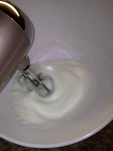 Pour the egg whites into a large bowl. With the handmixer beat the egg whites until stiff peaks form. This process takes about five to eight minutes.