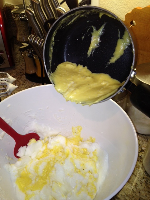 Add the cheddar cheese and four large pinches of truffle salt(or salt). Mix well. Once the cheese is completely melted, remove the saucepan from the burner, and then turn off the stove. Pour the roux mixture slowly into the egg whites. You want to keep the egg whites fluffy, so gently fold the egg whites with the roux. Do not stir. Stirring will cause the egg whites to lose its fluffiness.