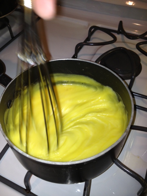 Now, set aside the egg whites. Take the small sauce pan, and place a half a stick of butter into the pot. Set the heat to low. You will need your whisk for this step. Once the butter is melted, add a quarter cup of flour. This mixture is called a roux.