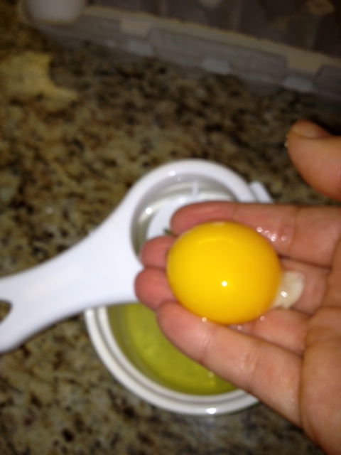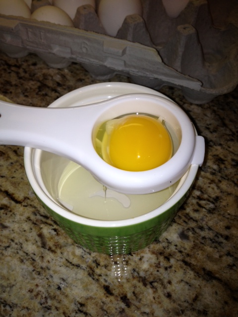 You can do this by hand if you don’t have a yolk separater. When using a yolk separater, sometimes the egg white doesn’t separate so easily, so just carefully, with clean hands, pour the yolk into your fingers so the egg white can run off into the ramekin. Be very careful not to get any yolk in the egg whites.