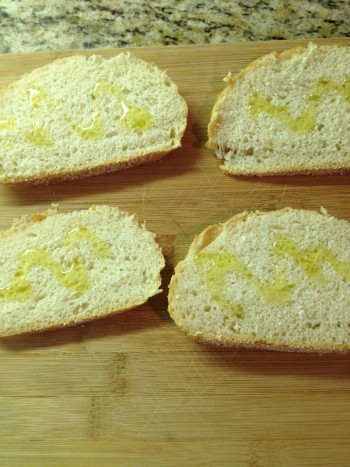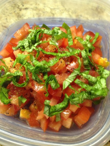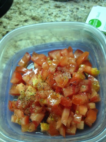 Dice up the Roma tomatoes, and place them in a small dish. Add some olive oil to the tomatoes. Add however much olive oil you’d like, but don’t drench the tomatoes. I added about 1/2 tblspn, then sprinkle in some salt and pepper and mix…