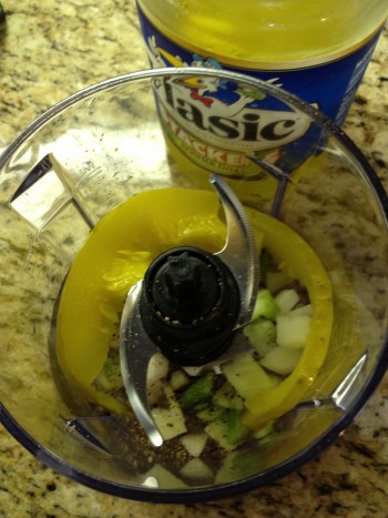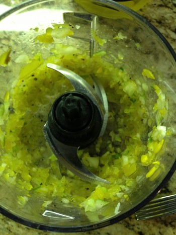 In the food processor, add your onion and celery, pickle, celery salt and ground pepper. I love celery salt. It adds a nice fresh flavor to any dish. I highly recommend keeping some in your pantry.