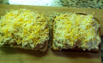 On a cutting board, place your slices of bread. Scoop a generous amount of tuna on to each slice, then sprinkle on some cheddar cheese…