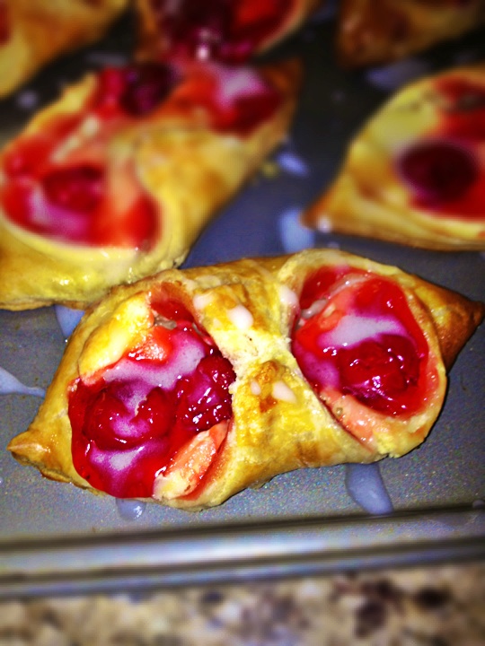 Add a tablespoon of water to the egg white that we saved from earlier. Give it a quick mix with a fork. Brush each pastry with the egg-white wash. This will give the pastries a nice gloss. Don’t brush the cherry filling though, only the dough.