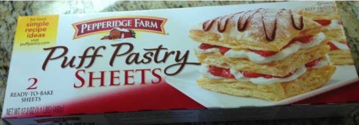 The puff pastry comes frozen. Be sure to take the pastry out of the freezer 30 minutes before you start. Usually, when you buy the packaged puff pastry, you will get two sheets. This recipe calls for one, but if you plan on using both, just double the ingredients.