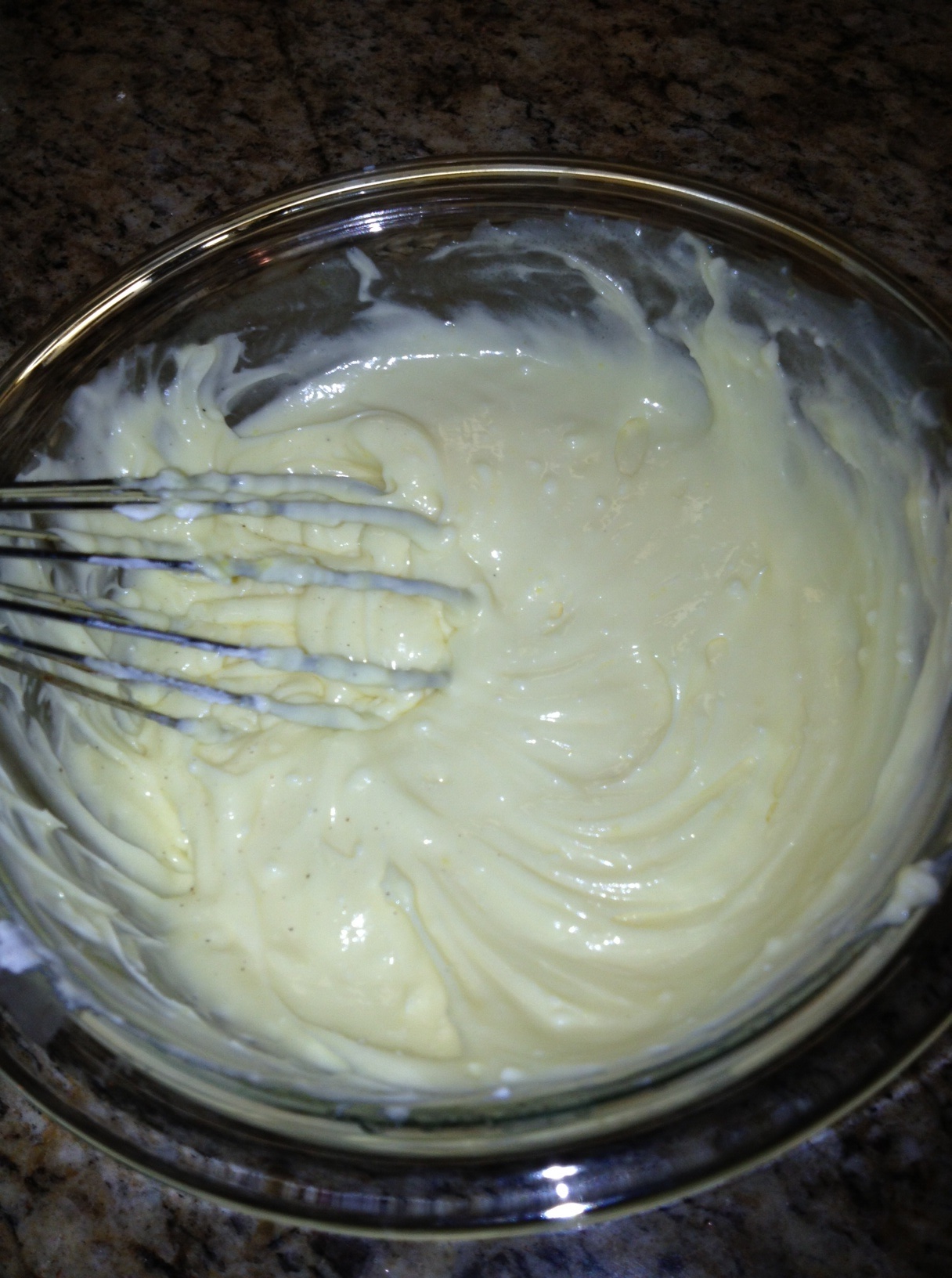 While the pastry is thawing, prep the cheese filling. Add three tablespoons of sugar to the 4 ounces of softened cream cheese, one tablespoon of sour cream and one egg yolk. Mix the ingredients well. It should have a smooth consistency.