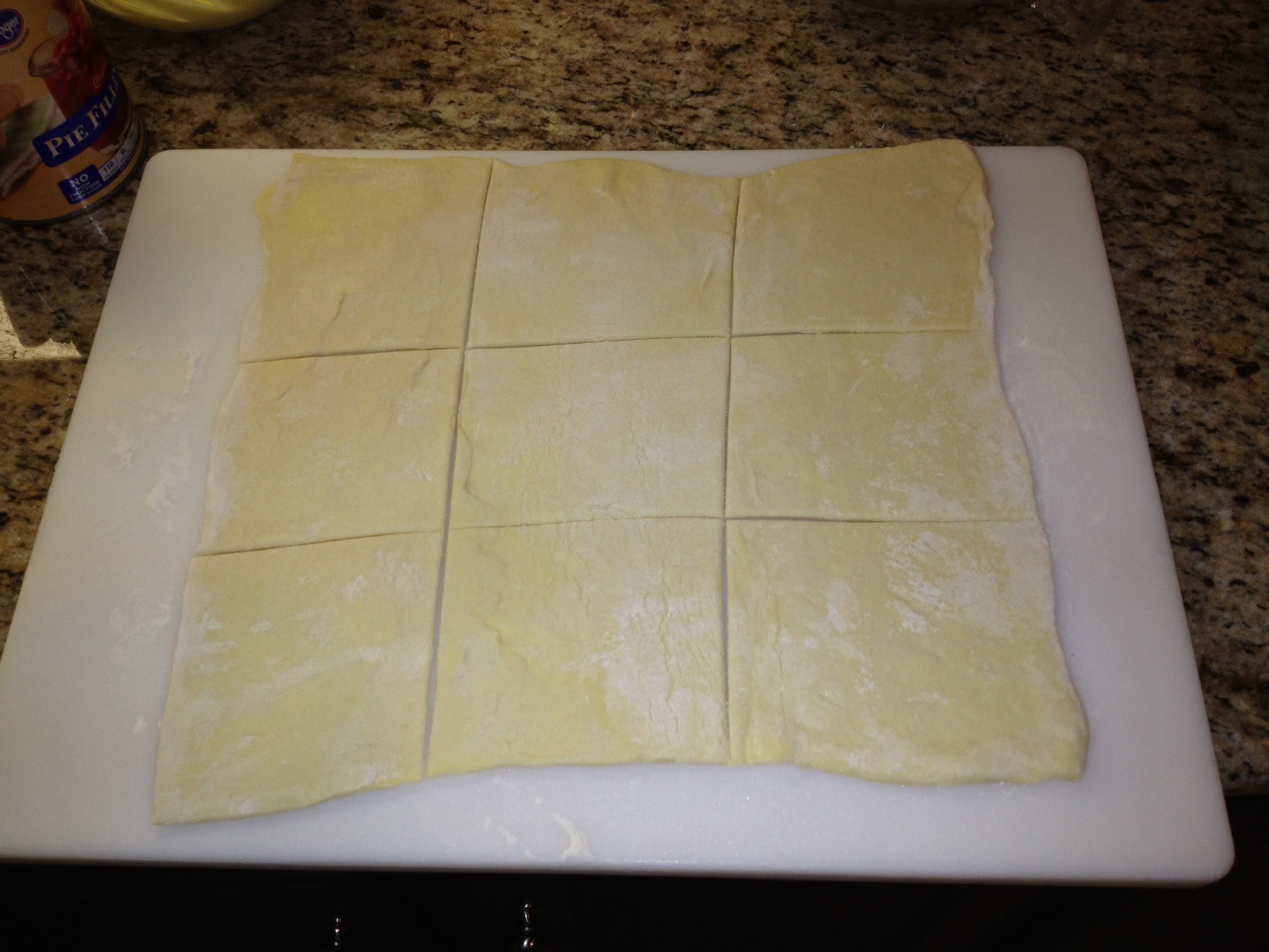 Time to work on the puff pastry. Dust the cutting board and rolling pin with flour. Place one sheet of puff pastry on the board. Roll the pastry to about one to two inches bigger than its current size. Add more flour if needed.
