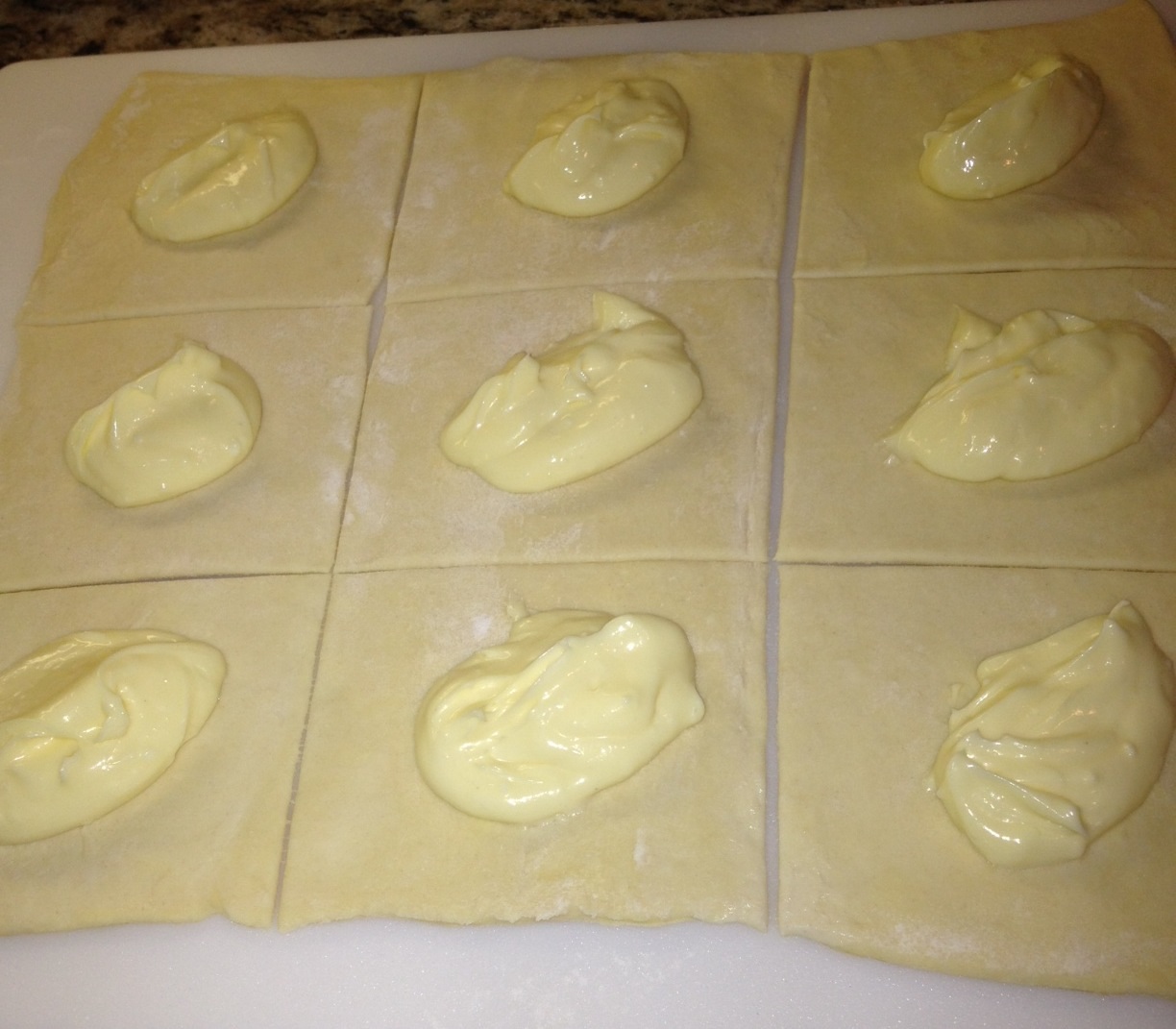 Scoop 1&1/2 to 2 tablespoons of cream cheese filling onto each square…