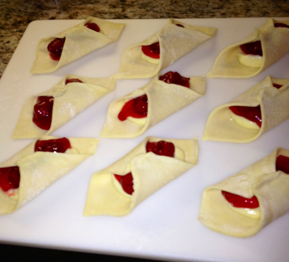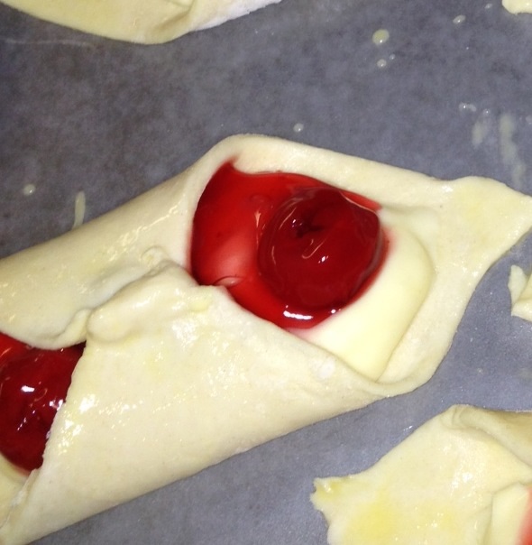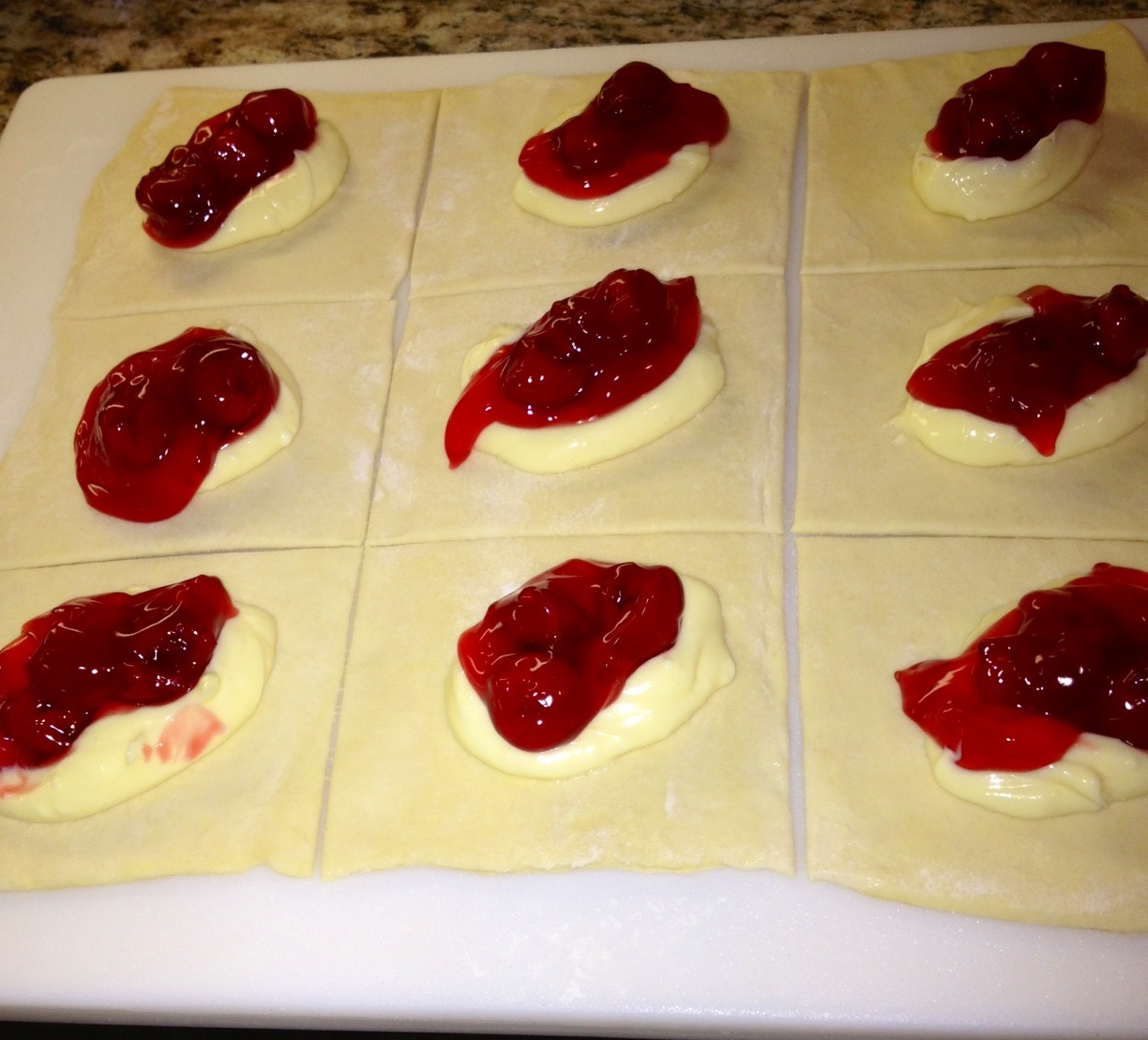 Scoop a tablespoon of the cherry filling on top of the cream cheese. Each pastry can fit two to three cherries.