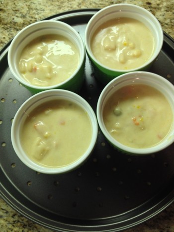 Only three items needed for this quick chicken pot pie recipe; two cans of hearty chicken pot pie soup from Progresso, four ramekins and pie crust. I paid only $6 for this dinner; pie crust $2 and two cans of soup for $4. What a bargain!