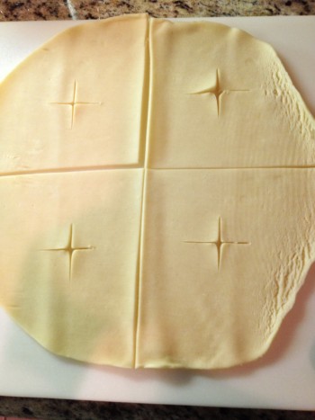 Place the pie crust onto a cutting board. Cut the pie crust into four equal parts and slice a small cross into each quarter…