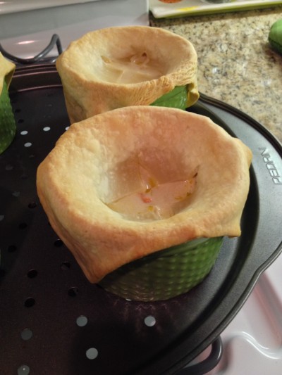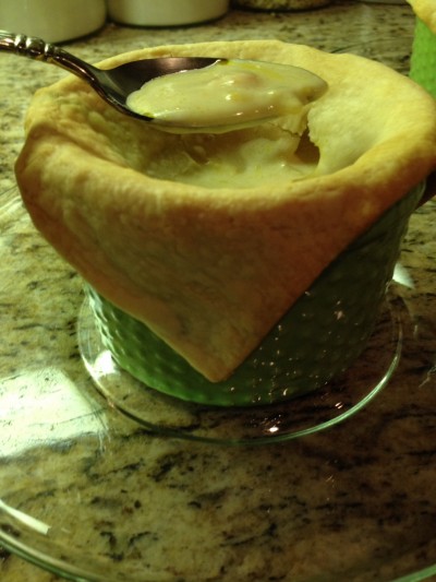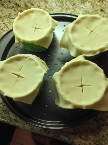 Cover each ramekin with the pie crust and pinch the edges slightly…