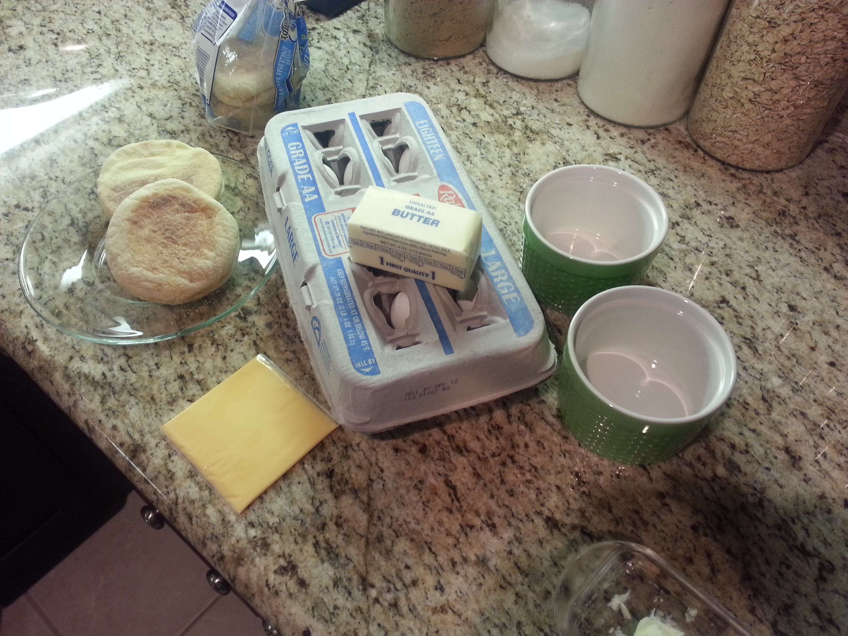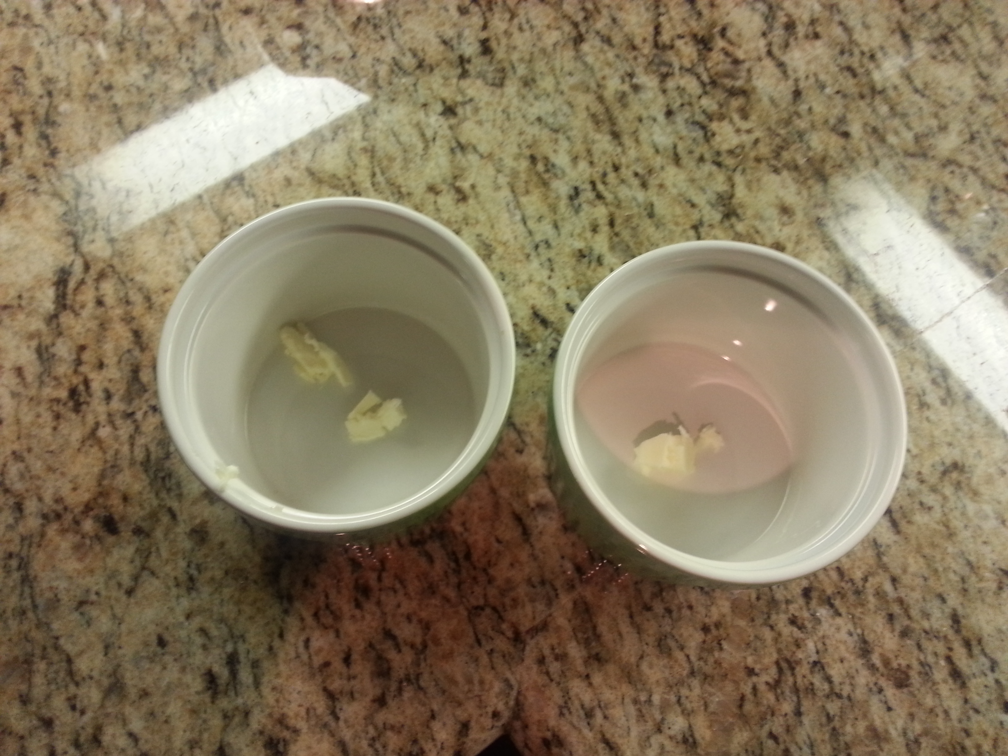 Now, place two small pieces of butter into the ramekin (or you can you use canola oil spray. if you use canola oil spray, you can skip this step and move right to cracking the egg into the ramekin.) With the butter in the ramekins, place them in the microwave for 20 seconds. After 20 seconds, remove the ramekin. Careful, it will be HOT! Grab the butterknife and just move the butter around the bottom of the ramekin. I like to remove excess butter. All you need to do is just coat the bottom of the dish.