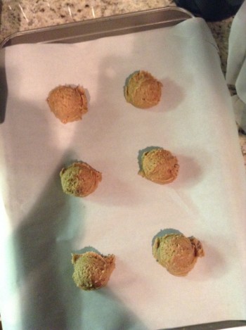 After mixed, the cookie/cake mix should have a doughy consistency. Use a cookie scoop if you have one to make even-sized cookies. I have a cookie scoop that makes one-inch rounds. Place the dough on a cookie sheet lined with parchment paper…