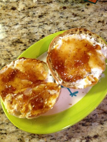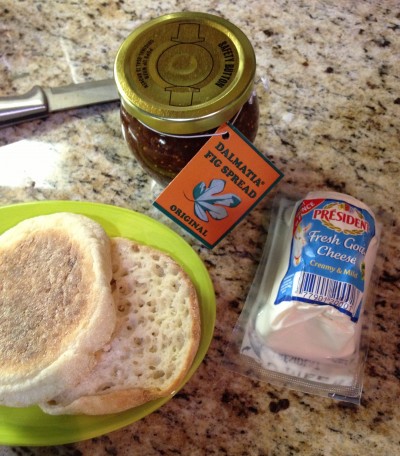 Hey, Everyone! I have a quick snack idea that I want to share. Goat cheese and fig spread on a toasted English muffin. Had one earlier today! Could eat another right now, but got to watch the cholesterol.