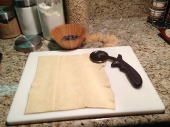 With the pizza cutter, cut along the two creases of the pastry sheet.