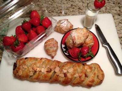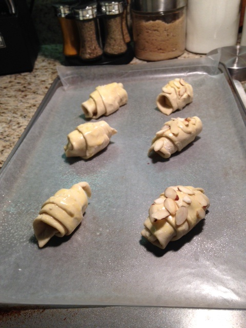 Just as we did with the previous pastries, brush the top with the egg and sprinkle some sliced almonds on top. Bake in the oven for 30 minutes. This one required a little more than the smaller pastries. Place this in the fridge if the oven happens to be occupied by our other pastries.