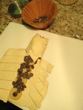 Mold the cut almond paste to create an oval shape. After doing so, place the almond paste on the largest part of the cut pastry…