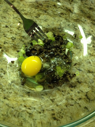 Now, time for the meat mixture. In a medium bowl add half a packet of onion dip, bread crumbs, one egg, salt, pepper, scallions and black olives…